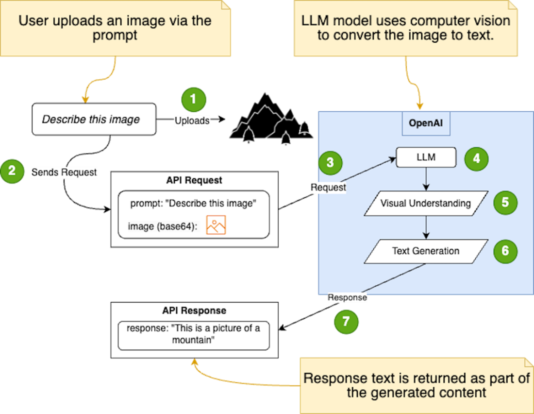The image illustrates the process of sending an image alongside a text prompt to the OpenAI API, and how the language model utilizes computer vision techniques to understand the image and generate a relevant text response.