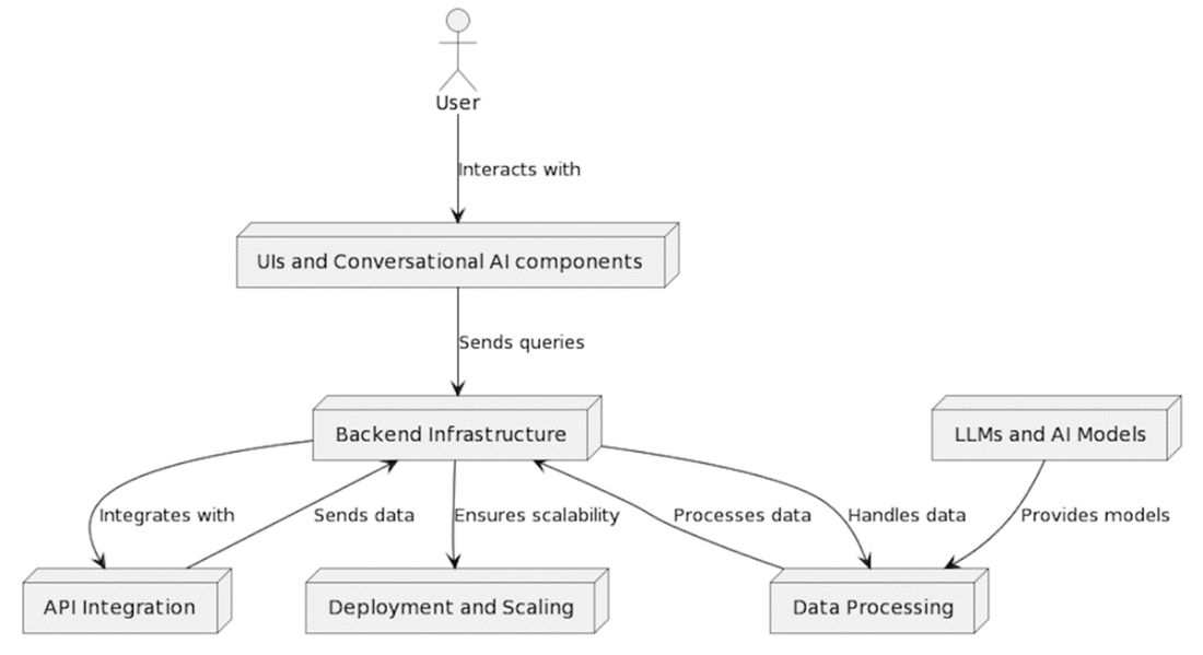 - Key components of generative AI web applications include AI models powered by large language models (LLMs), UI and conversational AI components, backend infrastructure, data processing pipelines, API integration, and deployment and scaling mechanisms.