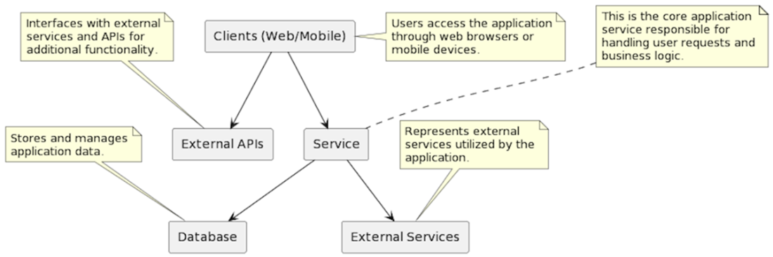 Simplified architecture diagram of a web application ecosystem. Clients, including web browsers and mobile devices, interact with the core application service, which handles user requests and business logic. The service interacts with a database to store and manage application data. Additionally, the service communicates with external APIs to access additional functionality and interacts with external services utilized by the application.