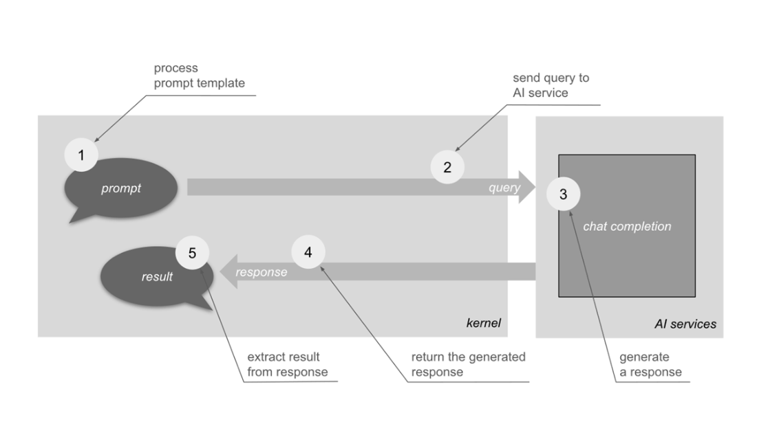 The diagram illustrates Semantic Kernel core functionality: building a prompt, sending the query to an AI service for chat completion, receiving the response from the AI service, and parsing the response into a meaningful result. These are essential steps for interacting with large language models through Semantic Kernel.