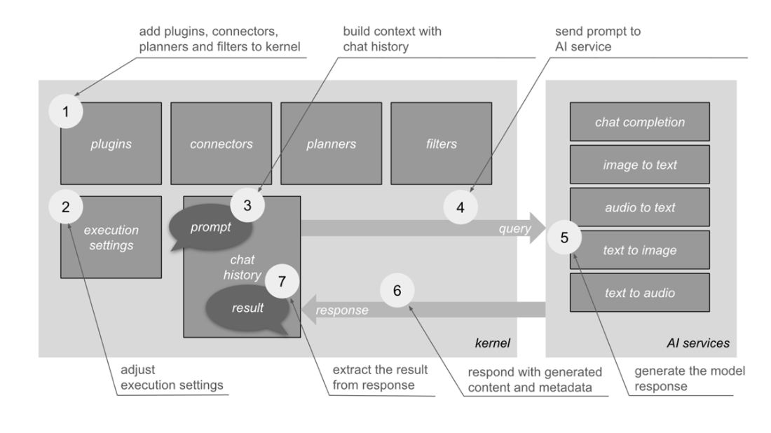 - Core components: connectors, plugins, planners, filters, chat history, execution settings, and AI services
