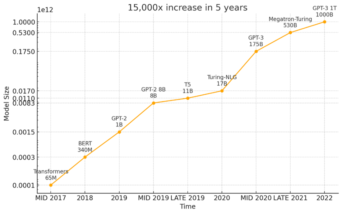Showing the exponential size increase in language models. Most of the newest models such as the newer GPT & Claude models do not reveal their parameter size but they are estimated to be over a trillion parameters.