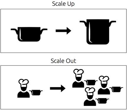 Scaling up replaces existing equipment with larger/faster/more efficient equipment, while scaling out divides the work between many workers in parallel.