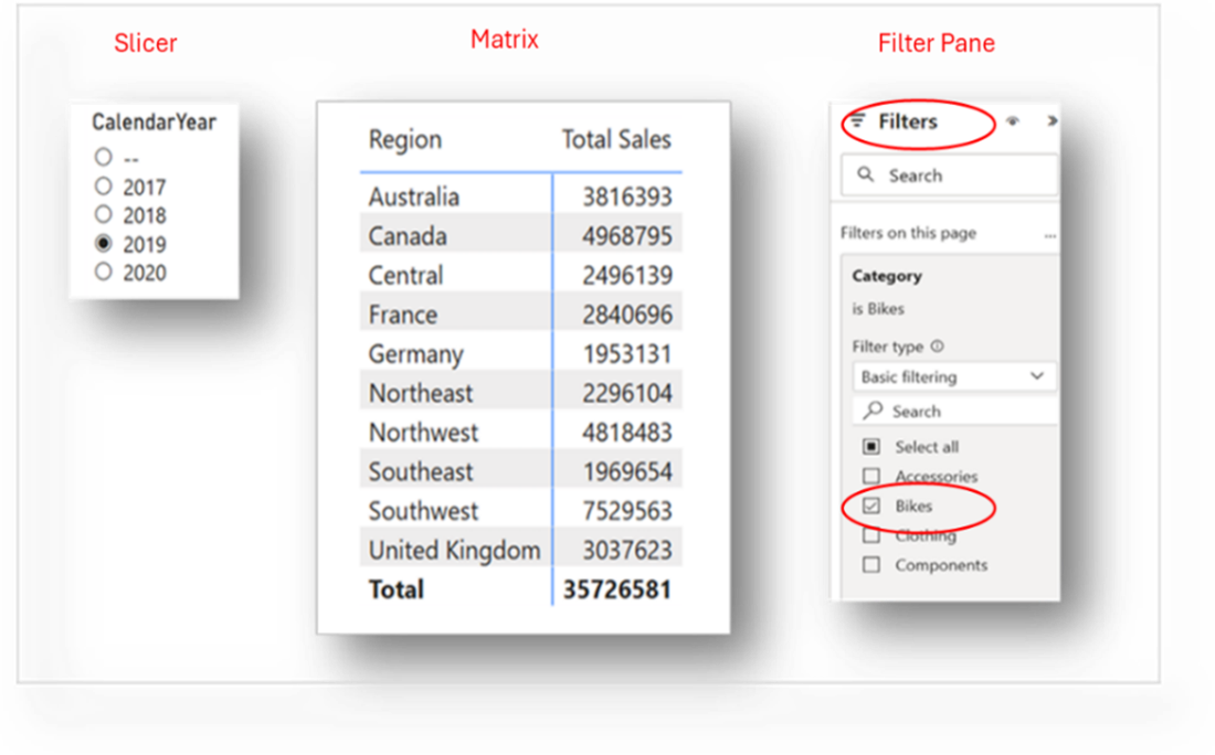 Power BI supplies much of the context through user interactions, visuals, slicers, and relationships.
