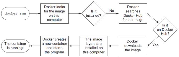 Rundocker run dockerinaction/hello_world. Docker checks for the image locally; if missing, it pulls it from Docker Hub, creates a new container, and runs its default command (which prints “hello world”). The container stops when that command exits. Running the same command again reuses the already-downloaded image but creates a new container each time.What’s the difference between a Docker image and a container (and how are images distributed)?