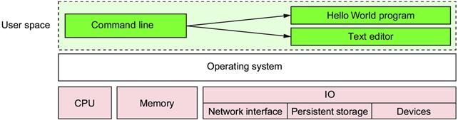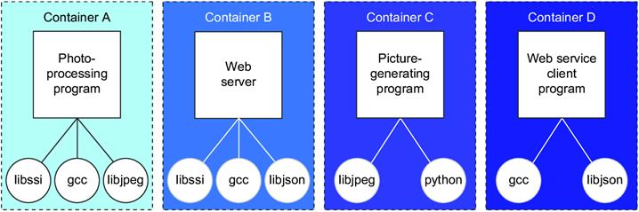 Example programs running inside containers with copies of their dependencies Figure 1.5 Dependency relationships of example programs