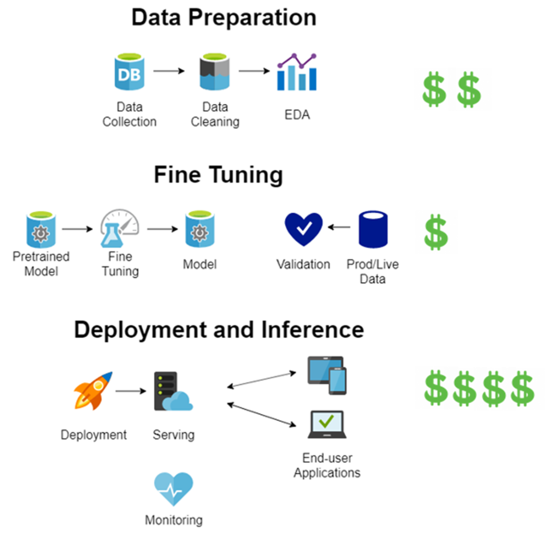 Order of magnitude of costs for each phase of LLM implementation when starting from a pretrained model