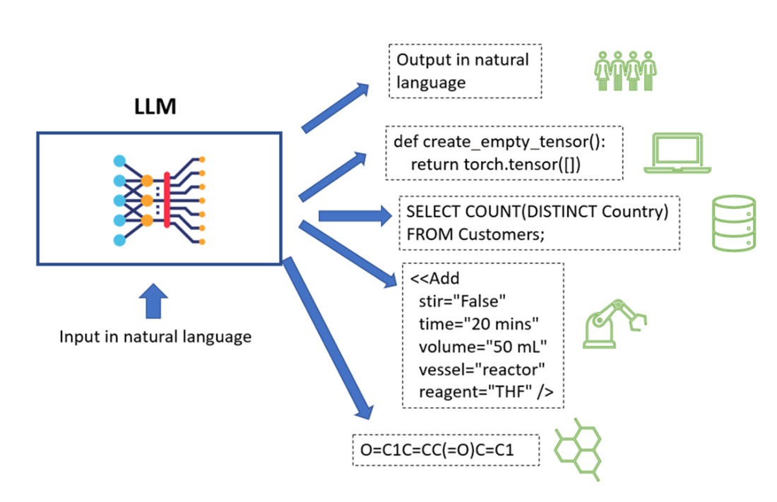 - LLMs can generate any symbolic content including code, math expressions, and structured data.