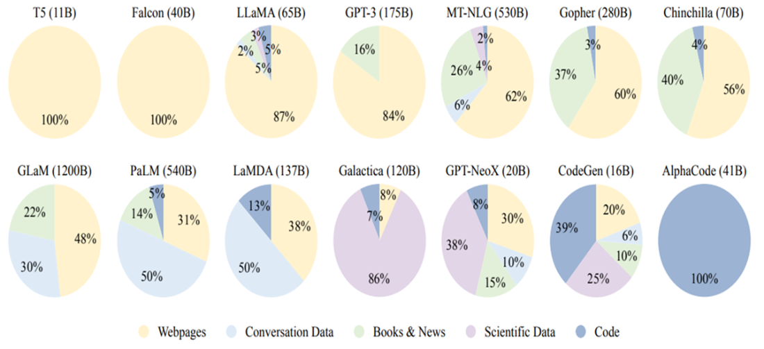 Ratios of data source types used to train some popular existing LLMs.