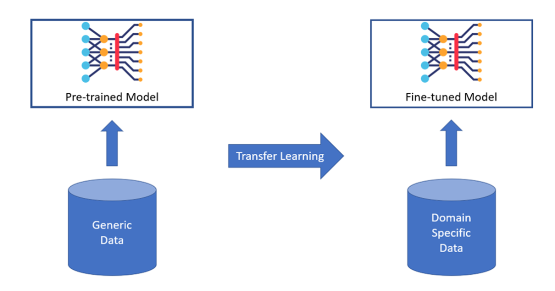 - Transfer learning adapts pre-trained models to specific domains using domain-specific data.
