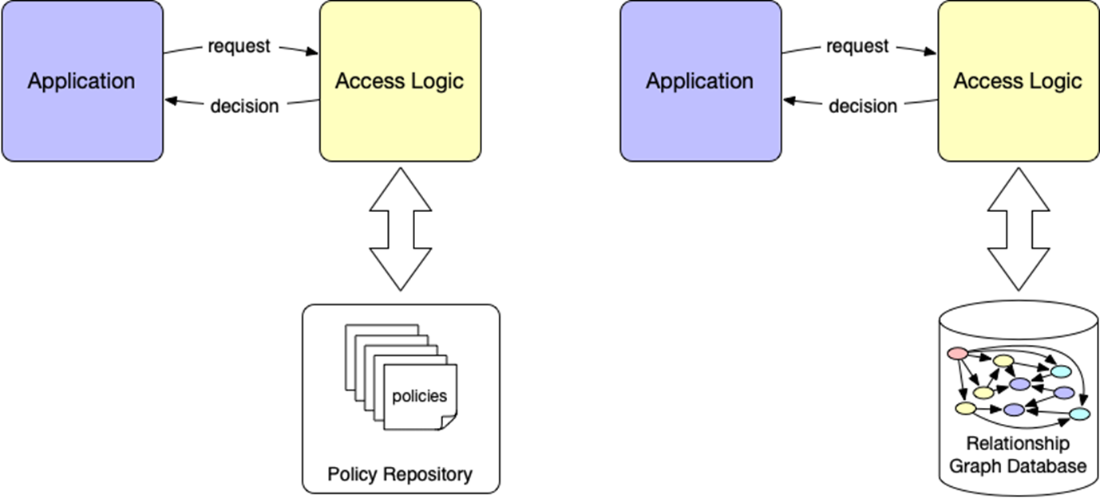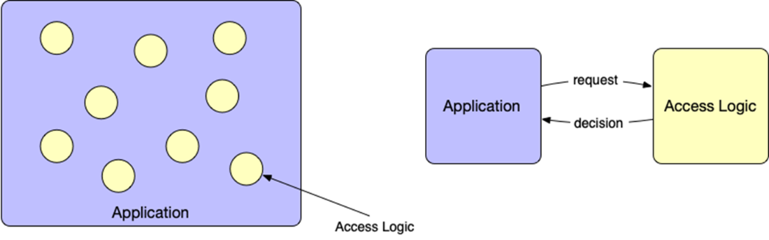 Embedding access logic throughout application code (left) creates tight coupling. Externalizing authorization into a separate component (right) makes access policies explicit, decouples decision-making from application behavior, and enables scalable, auditable access control.