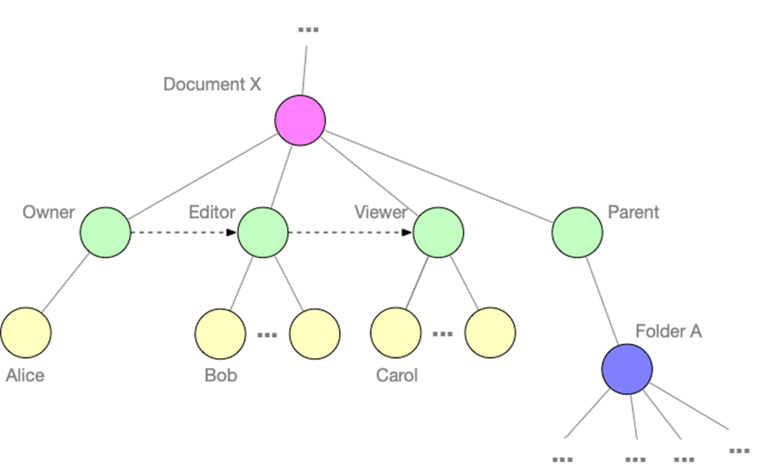 A relationship graph representing access to a Google document. Rather than use static ACLs, this model captures roles (like Owner, Editor, Viewer) as first-class relationships between users and resources. The graph also models hierarchical relationships (such as parent folders), enabling more flexible, general-purpose authorization logic that can be queried and evaluated dynamically.