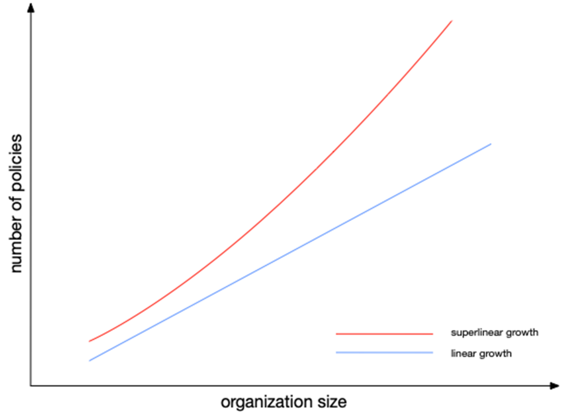 As an organization grows, the number of access policies tends to increase faster than linearly. Though a small organization might manage with a simple, flat set of policies, larger organizations face compounding complexity due to team structures, regional compliance, and overlapping responsibilities, leading to superlinear policy growth.