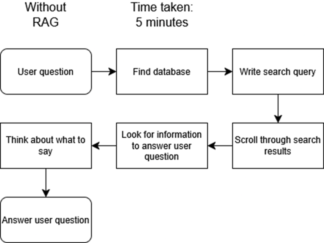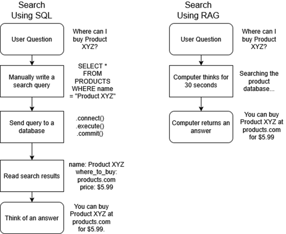 The left column shows the multiple steps and complexity of manually searching a SQL database for records. Compare this with the relative ease and simplicity of asking the question of a RAG chatbot instead,shown in the right column.