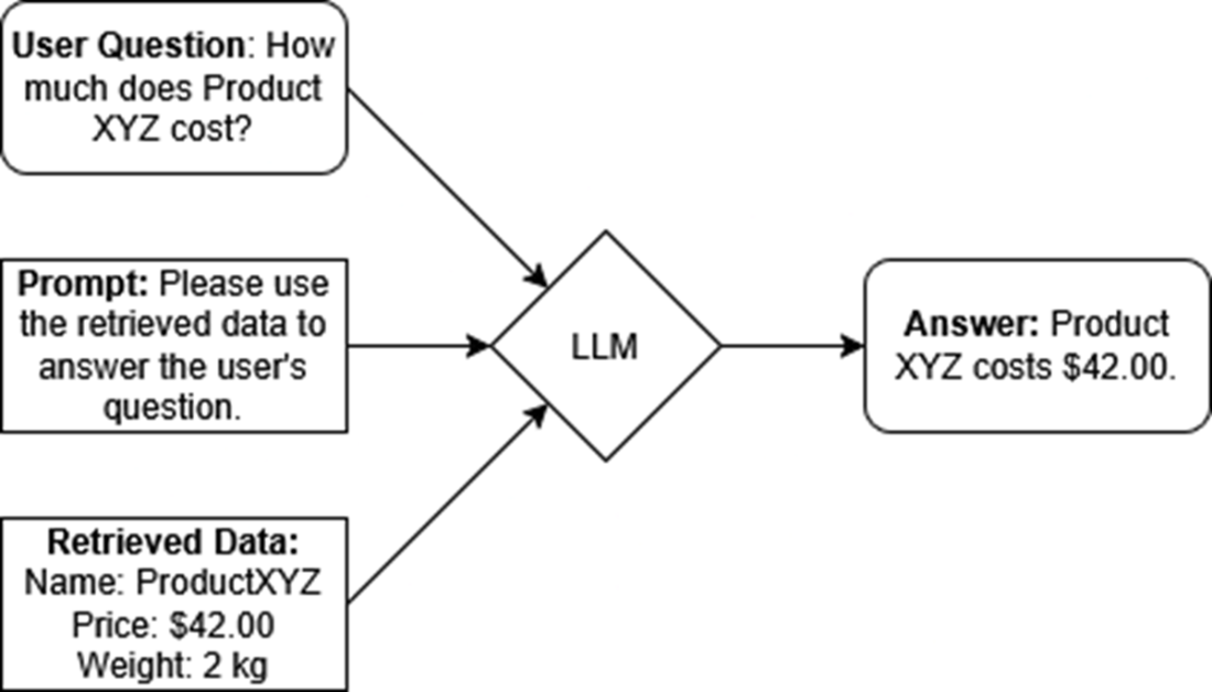 In a RAG system, the user question, the prompt, and the retrieved data are combined and sent to an LLM, which generates an answer using all that input information.