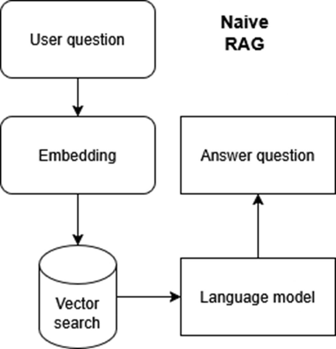 Basic RAG process with embedding, vector search, and a large language model. This simple approach is efficient but prone to errors and lacks context handling.