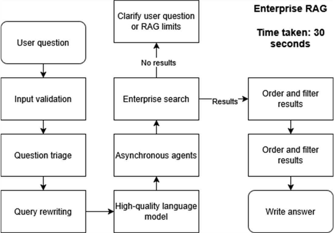 Enterprise RAG pipeline improves speed, accuracy, and scalability by incorporating validation, query rewriting, and asynchronous agents, reducing response times to 30 seconds..