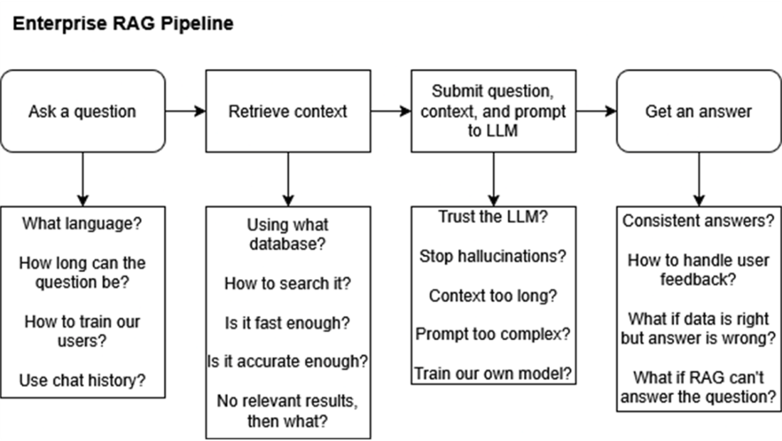 Key questions for designing enterprise RAG systems, addressing user input limits, database performance, context accuracy, and feedback management for better scalability and reliability.
