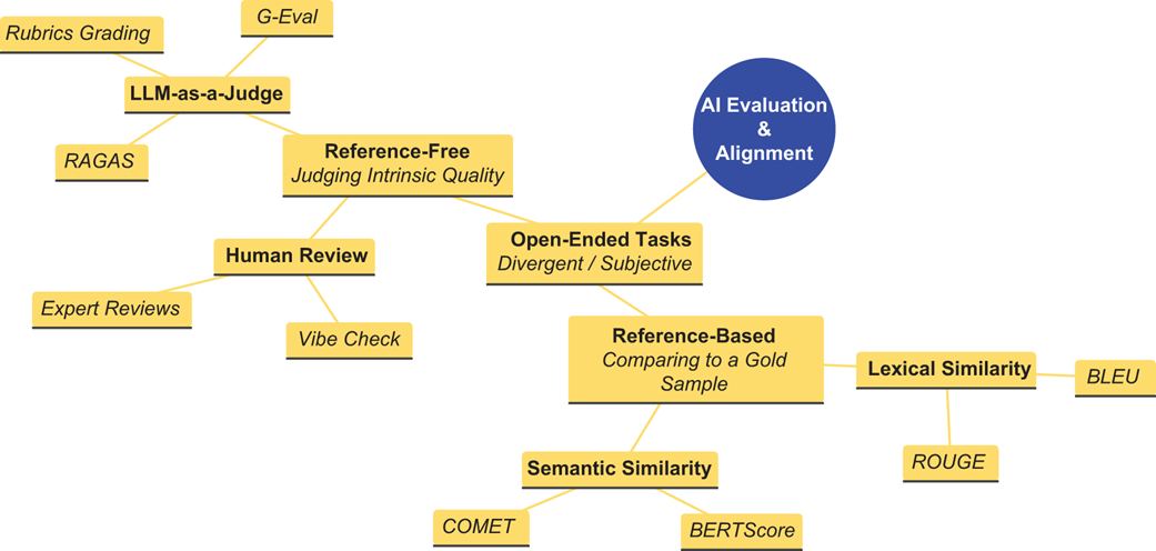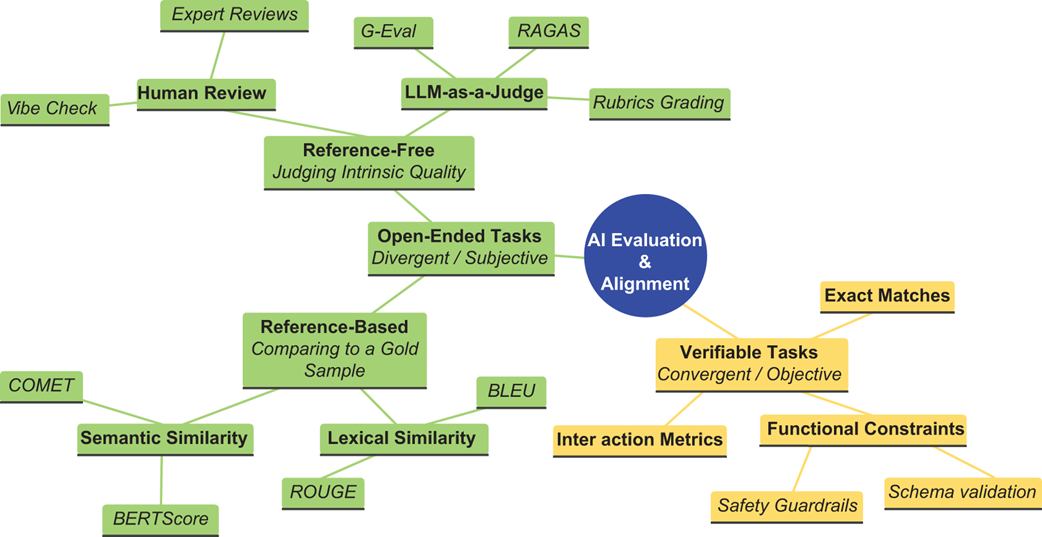 - Evaluations may use heuristic, statistical, semantic, or LLM-as-a-Judge methods to align with human evaluators, even though humans often disagree.