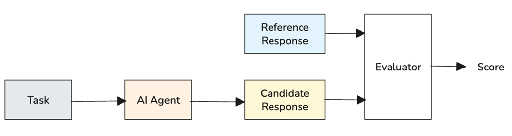 Reference-based evaluation workflow. Human experts create reference answers from a test set. The AI system generates candidate responses from the same inputs. The evaluator then compares each candidate's response with the corresponding reference response, producing scores.