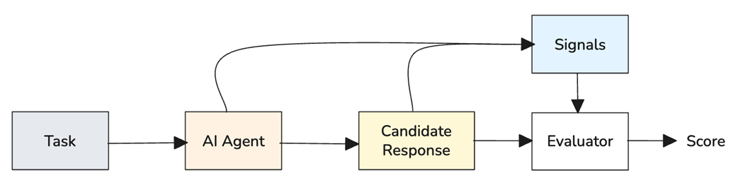 Reference-free evaluation workflow. Quality signals are defined for the task. The AI generates outputs for test inputs. Metrics assess each output’s intrinsic properties without reference answers. Scores reveal quality patterns and failure modes.