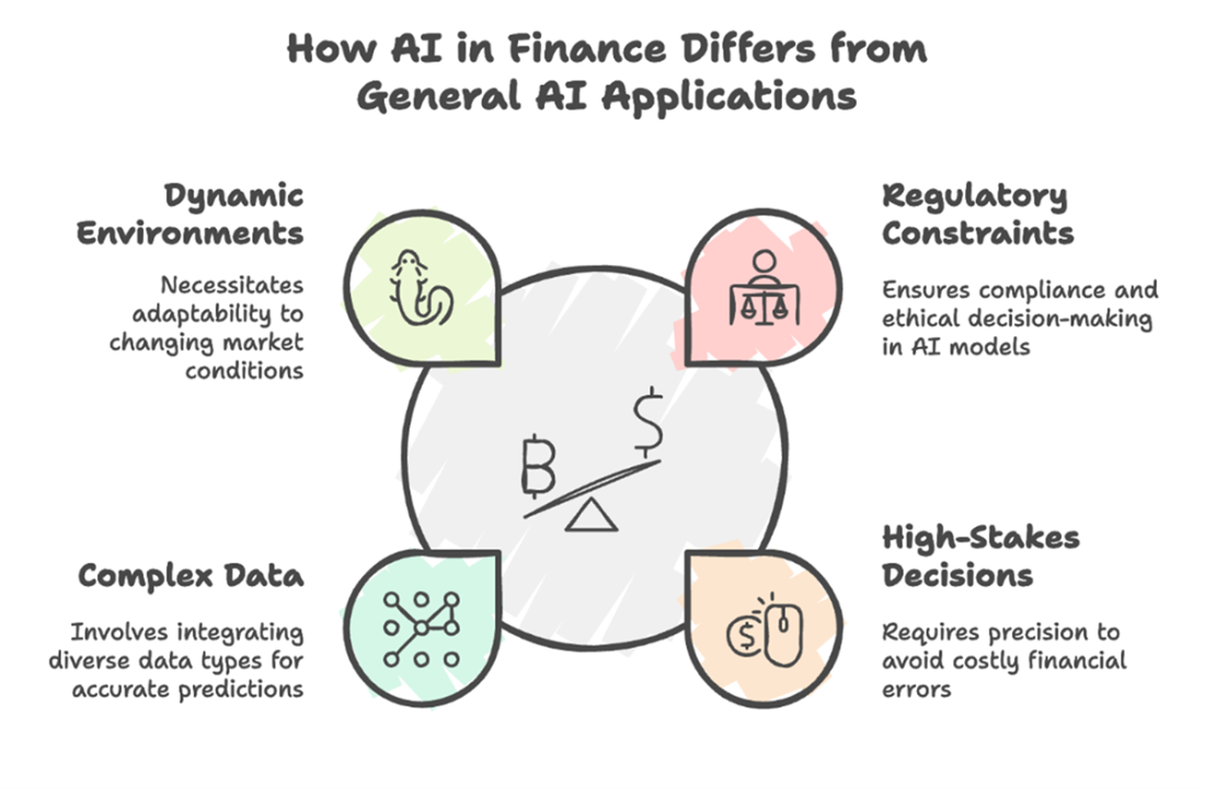 How AI in finance differs from general AI applications. Unlike many industries, finance requires continuous adaptation to changing markets, strict regulatory compliance ensuring fairness and explainability, uncompromising precision to handle high-stakes decisions, and the integration of diverse, complex data. These conditions shape every aspect of building and deploying effective AI-driven financial solutions.
