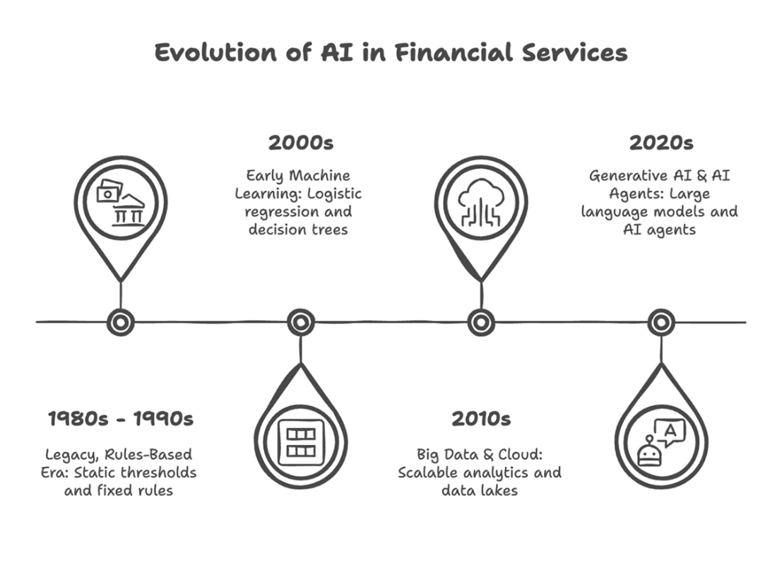 Evolution of AI in Financial Services. This timeline illustrates four major milestones in the industry's journey, from the static, rules-based systems of the 1980s and 1990s to today's generative AI and autonomous agents. Each phase—early machine learning, the rise of big data and the cloud, and the current wave of large language models—expanded AI's capabilities and its impact on the competitive landscape.