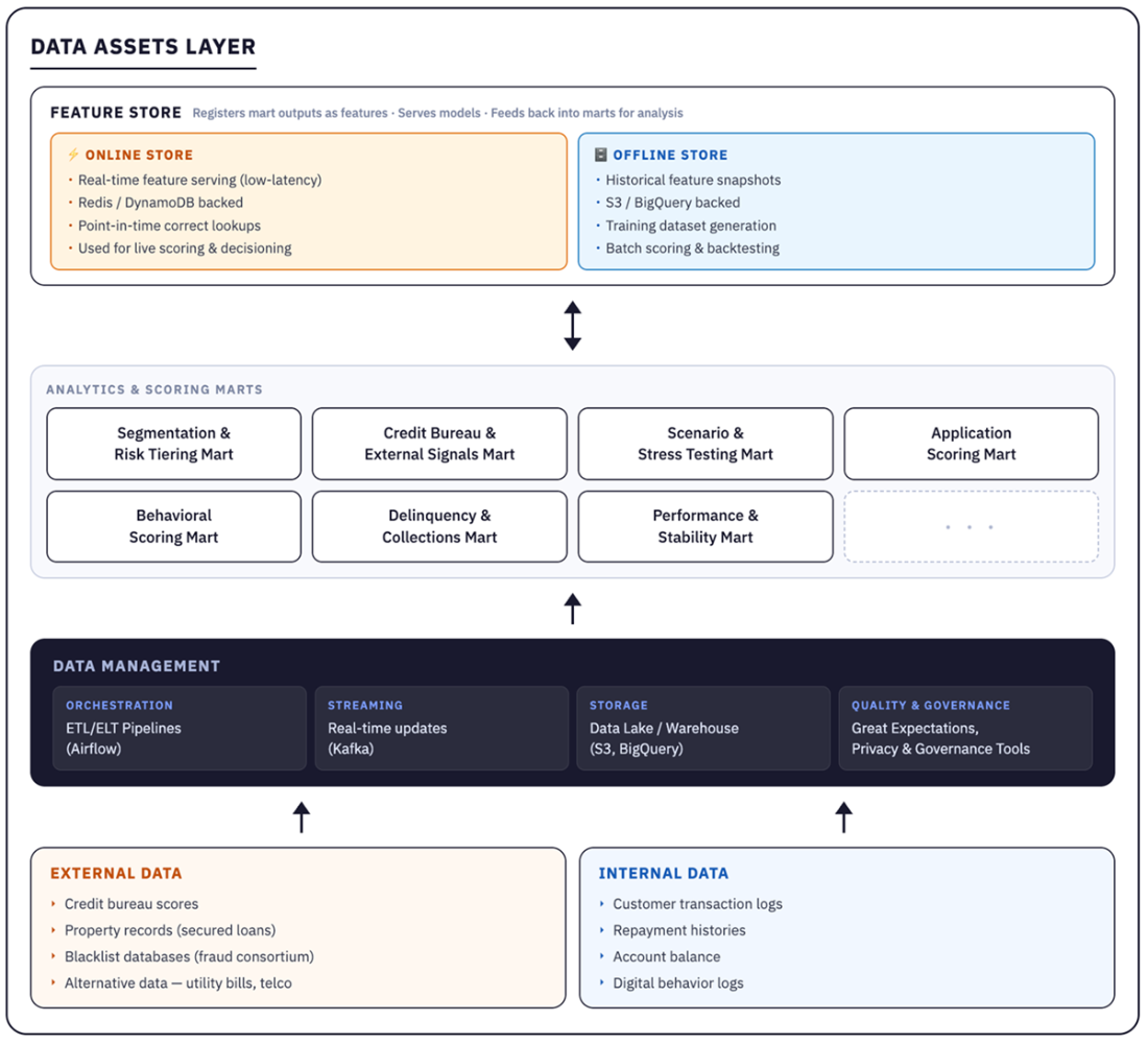 The Data Asset Layer. This figure illustrates how raw data—repayment histories, credit bureau snapshots, and alternative signals—flows into specialized data marts. Ensuring data lineage, access control, and regulatory compliance are critical steps before modeling. By creating consistent, domain-focused features, the Data Asset Layer provides a solid foundation for accurate credit decisions.