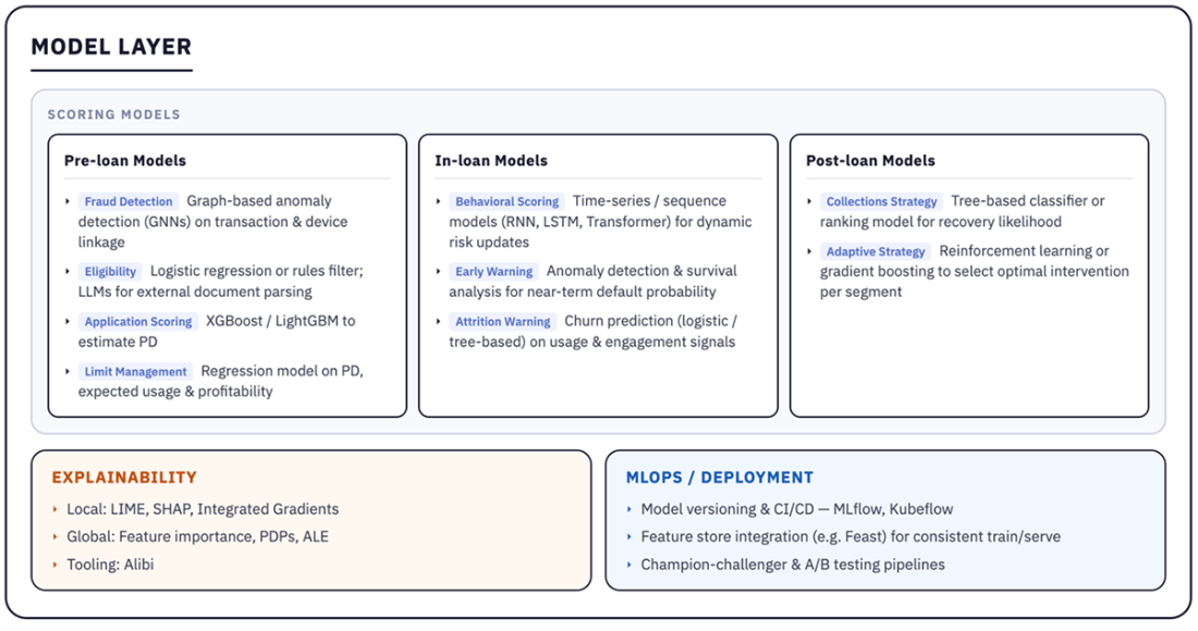 The Modeling Layer. Here, AI models turn curated features into default probabilities, fraud signals, or risk segments. Explainability tools (e.g., LIME or SHAP) offer transparency into each factor’s influence on the final score. Ongoing MLOps practices—such as scheduled retraining or hyperparameter optimization—help keep models current in shifting economic climates.