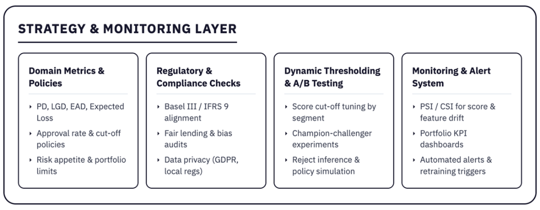 The Strategy & Monitoring Layer. Domain metrics, rate caps, and threshold policies shape how raw scores become lending actions. Ongoing monitoring detects data or concept drift, ensuring the model’s real-world performance remains stable. A/B testing and other experimentation approaches allow teams to refine credit strategies without risking large-scale exposure.