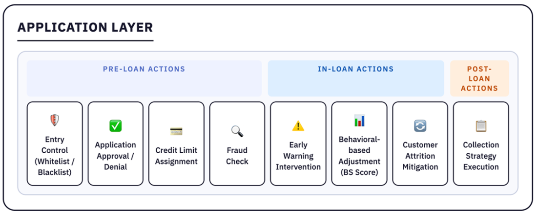 The Application Layer. Loan officers, collection agents, and end customers interact with AI-driven outcomes via dashboards or real-time notifications. By bridging front-end systems (like customer portals) and back-end rule engines, actions like approvals, limit changes, or fraud checks happen seamlessly. Because it’s closely tied to monitoring feedback loops, the Application Layer can adapt quickly to new data or policy shifts.