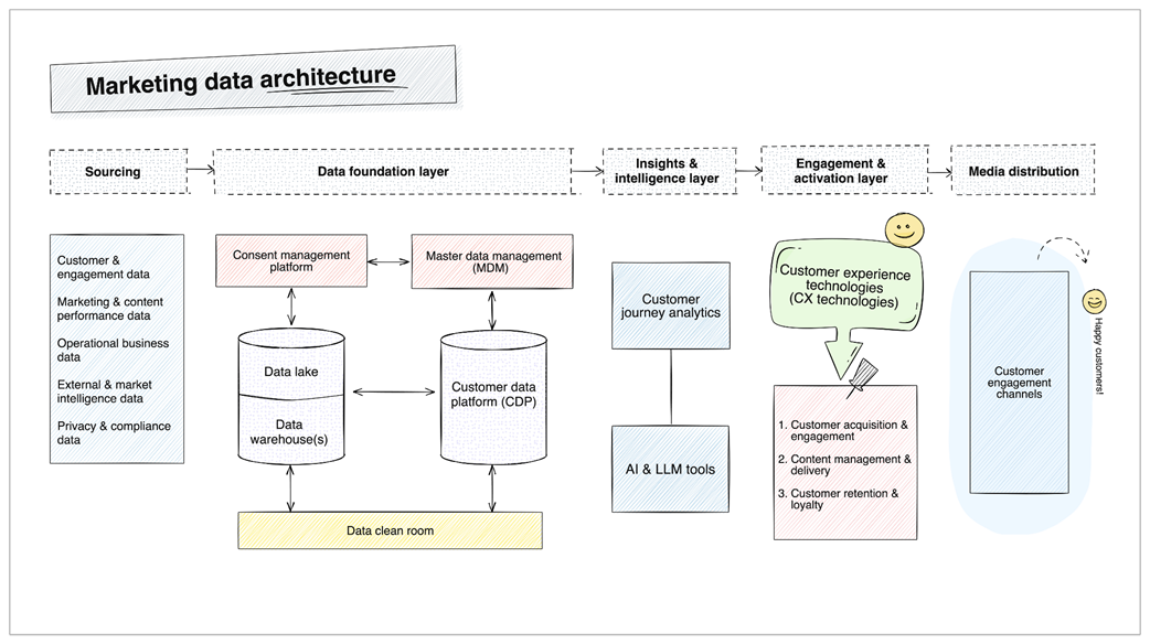 - Integrate privacy across the marketing data architecture layers: the sourcing layer, the data foundation layer, the insights and intelligence layer, the engagement and activation layer, and the media distribution layer.