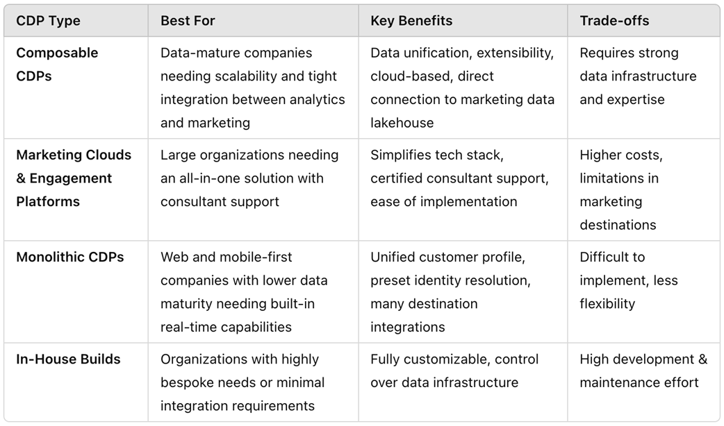 Composable customer data platforms are an excellent option for companies that desire the data unification, extensibility, and cloud innovation provided by a solution directly connected to their marketing data lakehouse. They may want a tighter integration between their analytics and their marketing teams. This best supports more data-mature companies that want a solution that will scale.