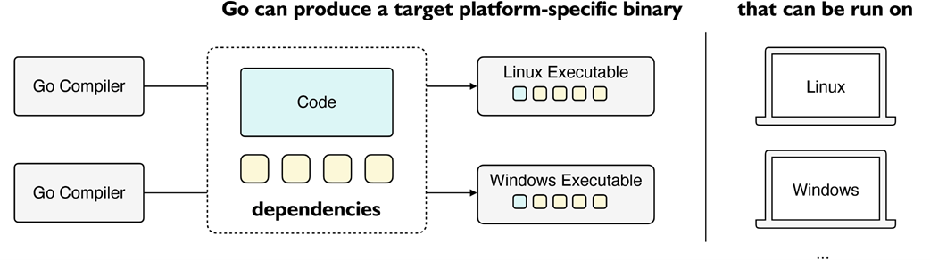 The Go compiler compiles code with all necessary dependencies into a single executable binary targeted for a specific operating system and architecture.