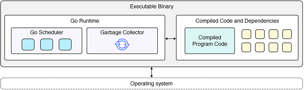 - Go executables include the Go Runtime, which has a scheduler for concurrent execution and a garbage collector that reclaims unreferenced memory.