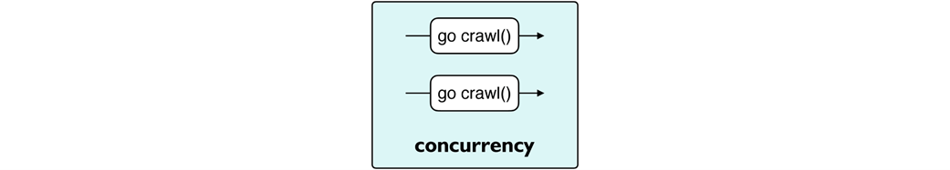 The go statement before a function spawns a new goroutine that runs the given function concurrently. This visual illustrates running the crawl function concurrently in two separate goroutines.