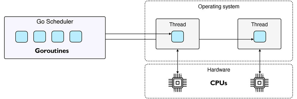 - The Go scheduler abstracts the operating system scheduler and threads.