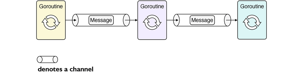 Goroutines that are running concurrently communicate over channels. These goroutines forward the message to the next goroutine, each performing some computation on the received message before sending it to the next one.