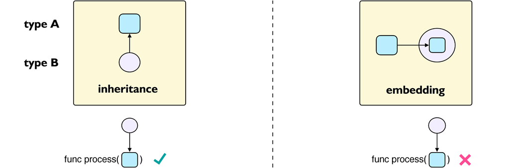 While inheritance creates a type hierarchy, embedding does not. In inheritance, you can pass parent (square) and child (circle) types interchangeably to a function that expects only the parent type. With embedding, the function can only work with the specified type. Embedding does not form a type hierarchy. Embedding simply makes one type's methods and data part of another type.