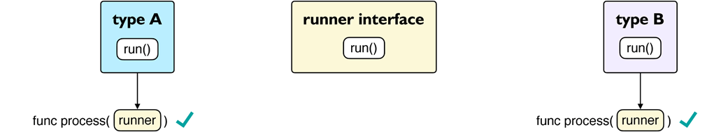 The function expects a type that implements the runner interface (any type with a run() method). You can interchangeably pass either of these types to the function because each has a run() method and implicitly satisfies runner.