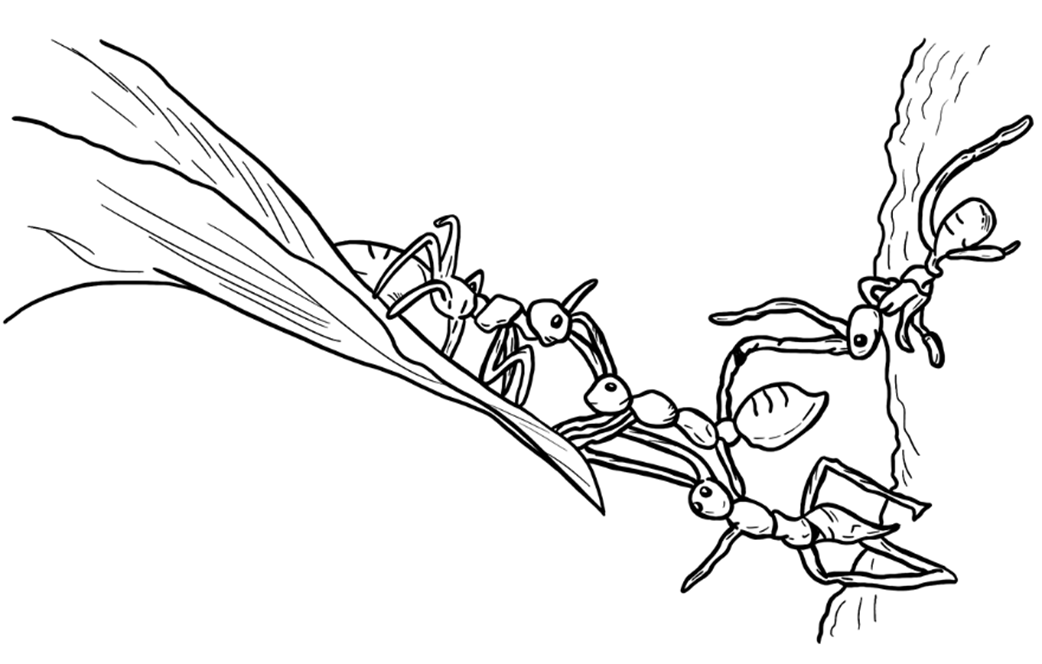 A group of ants working together to cross a chasm