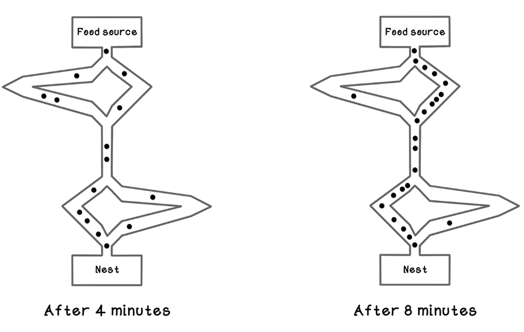 What is swarm intelligence, and how do ants inspire Ant Colony Optimization (ACO)?Swarm intelligence refers to problem-solving that emerges from simple agents interacting locally, producing intelligent global behavior. Ants inspire ACO by showing how individuals leave and sense pheromone trails to coordinate: as ants move, they deposit pheromones; other ants probabilistically prefer stronger trails, leading the colony to converge on effective paths (like shortest routes).Why do real ants converge to the shortest path in the asymmetric bridge experiment?The shorter path “wins” due to speed and positive feedback. Ants on the short bridge complete more round trips per minute, depositing more pheromone per unit time. This amplification attracts even more ants to the short route, quickly dominating the colony’s traffic.Which kinds of problems are well-suited to ACO?ACO excels at combinatorial optimization with large, rugged search spaces, including: