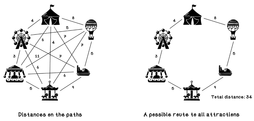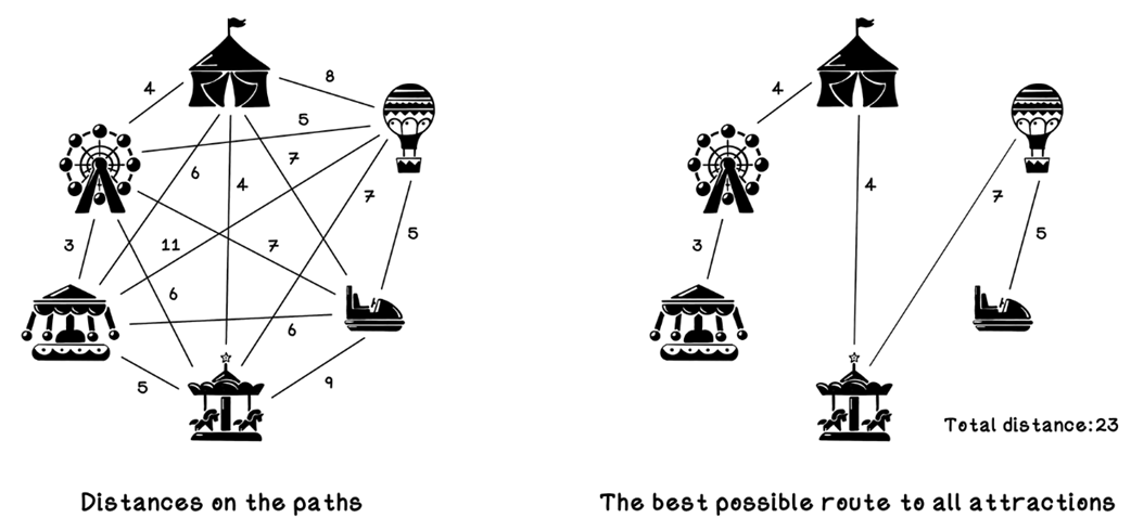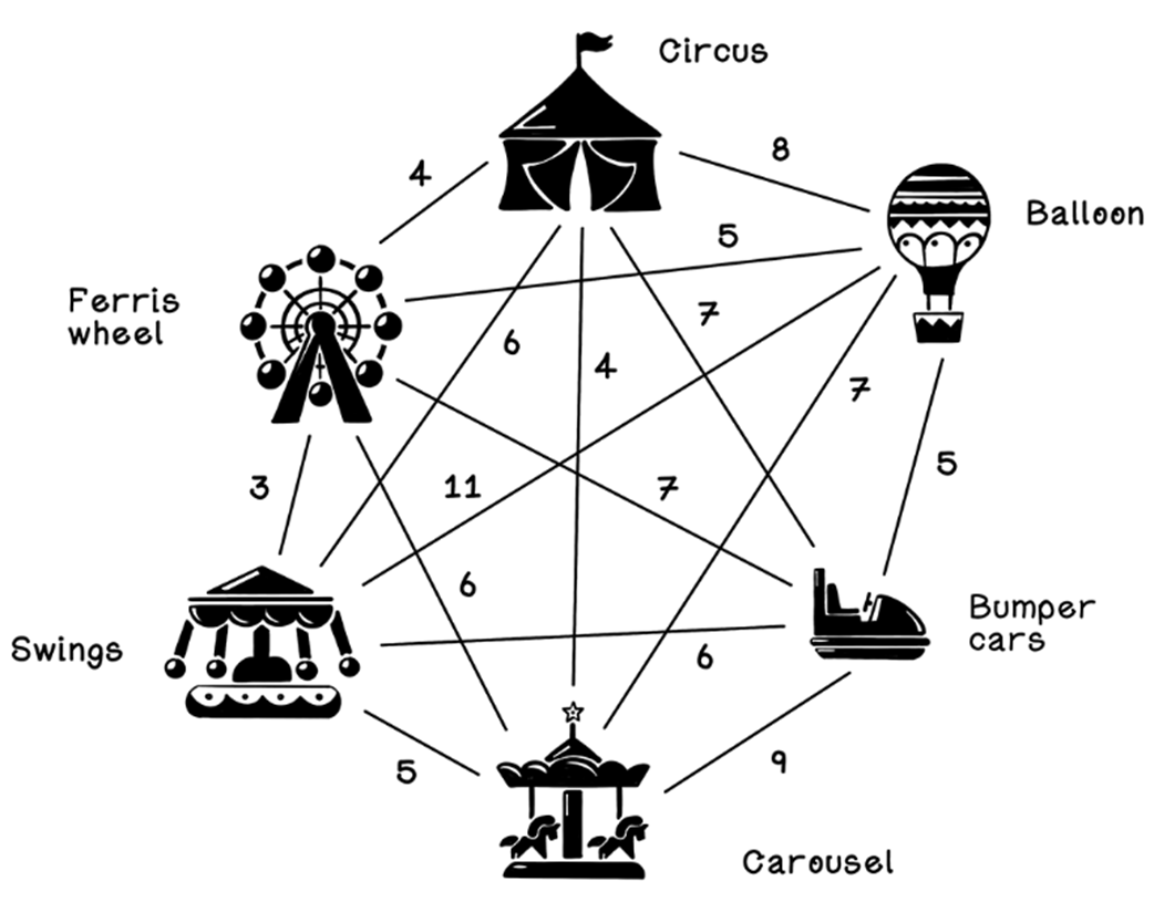 - Distance matrix: a 2D array where entry [i][j] stores the distance between attractions i and j