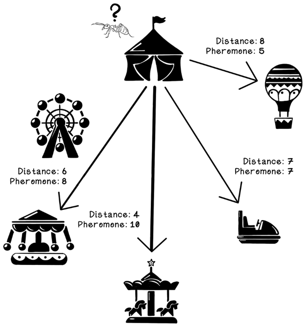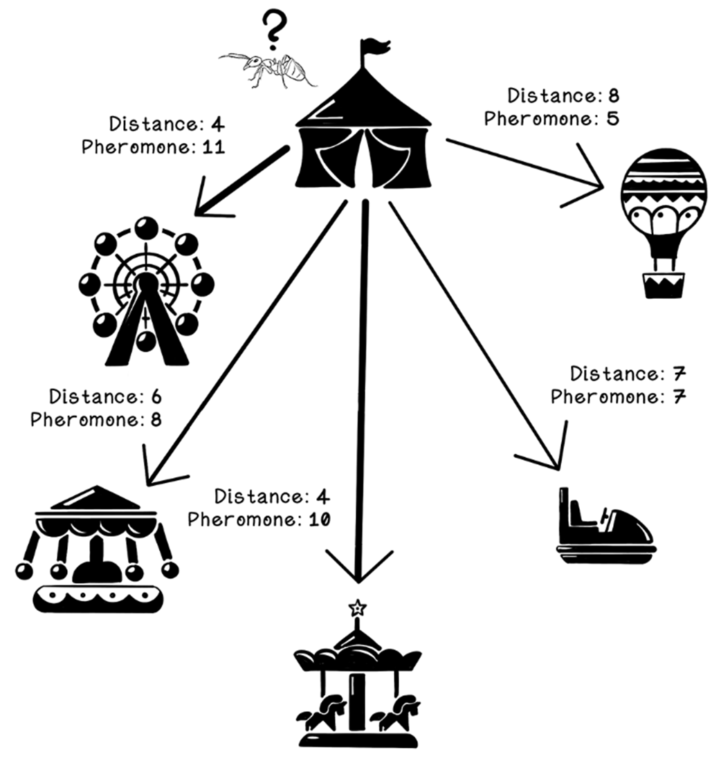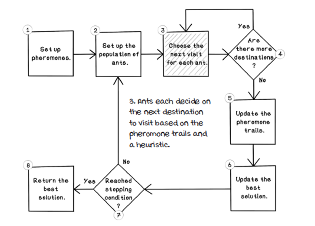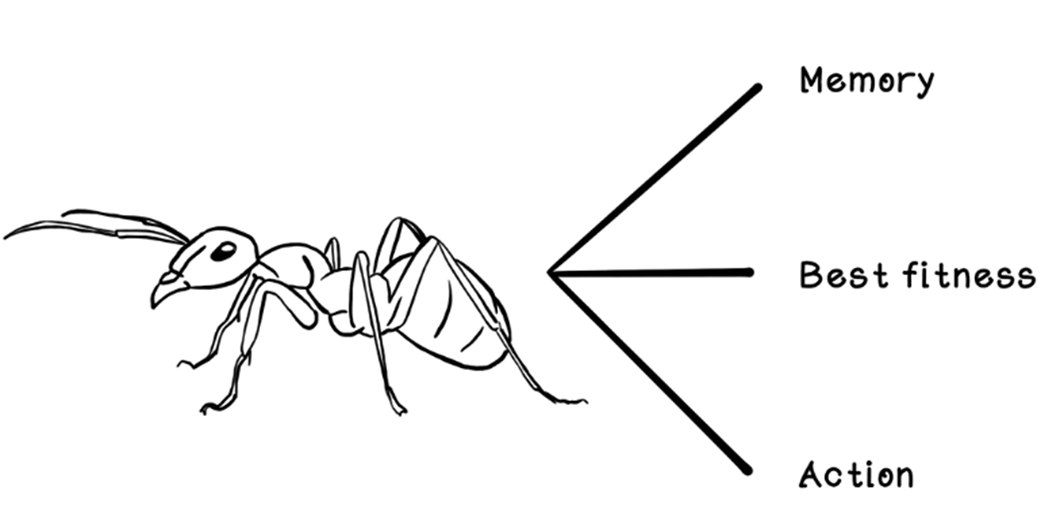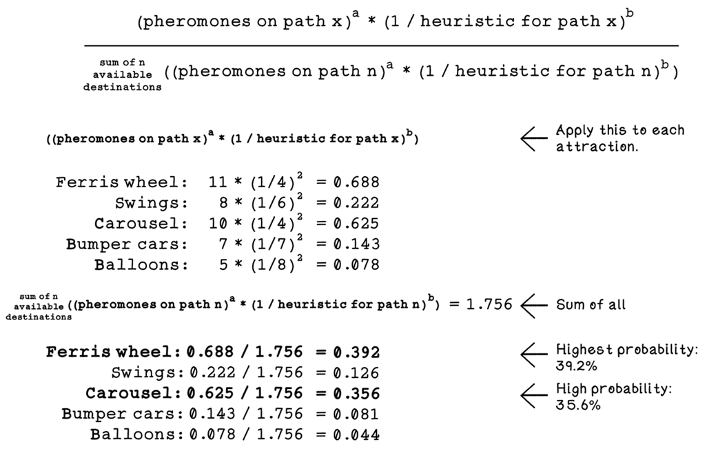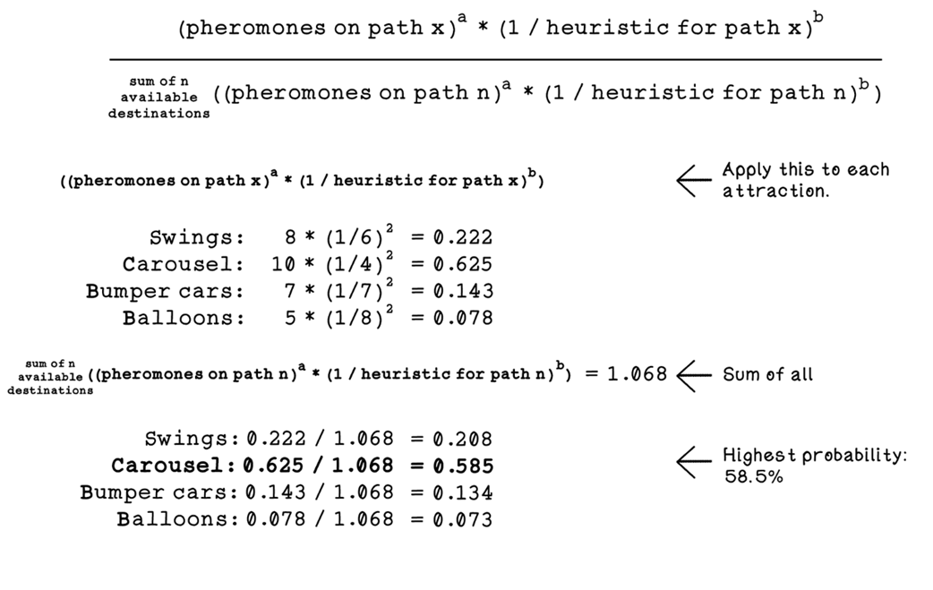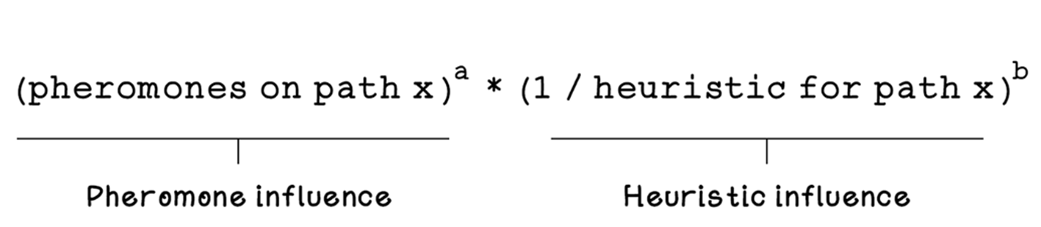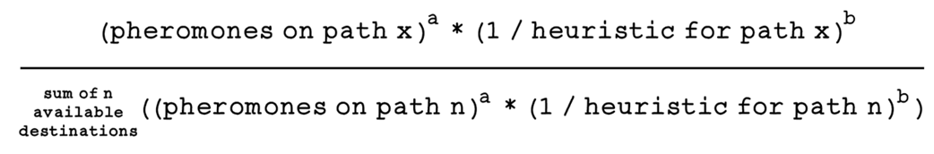 - Ant representation: stores visited nodes (memory), current position, and a way to compute tour length (fitness)How does an ant choose its next destination?For each unvisited neighbor, the ant evaluates: