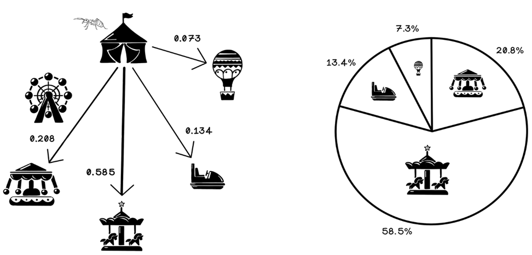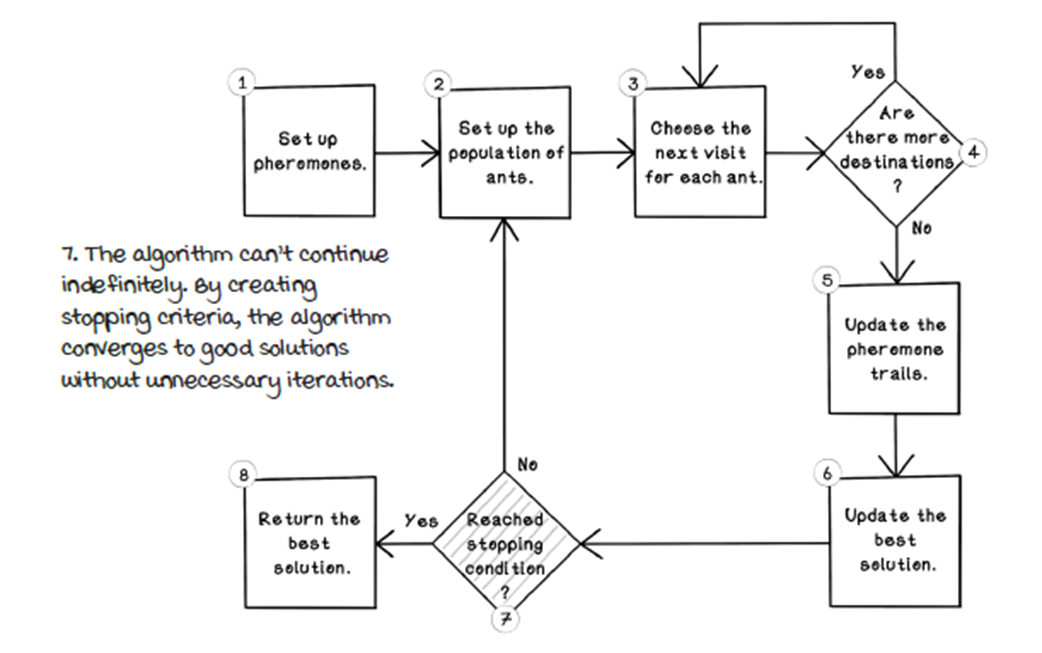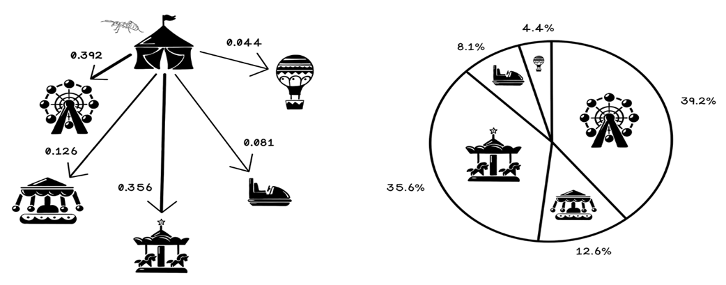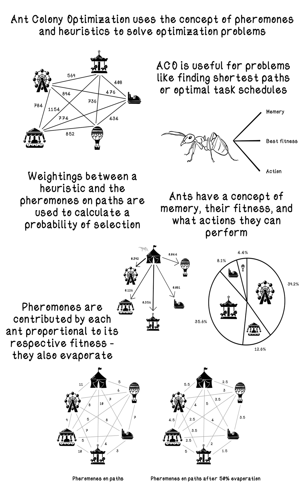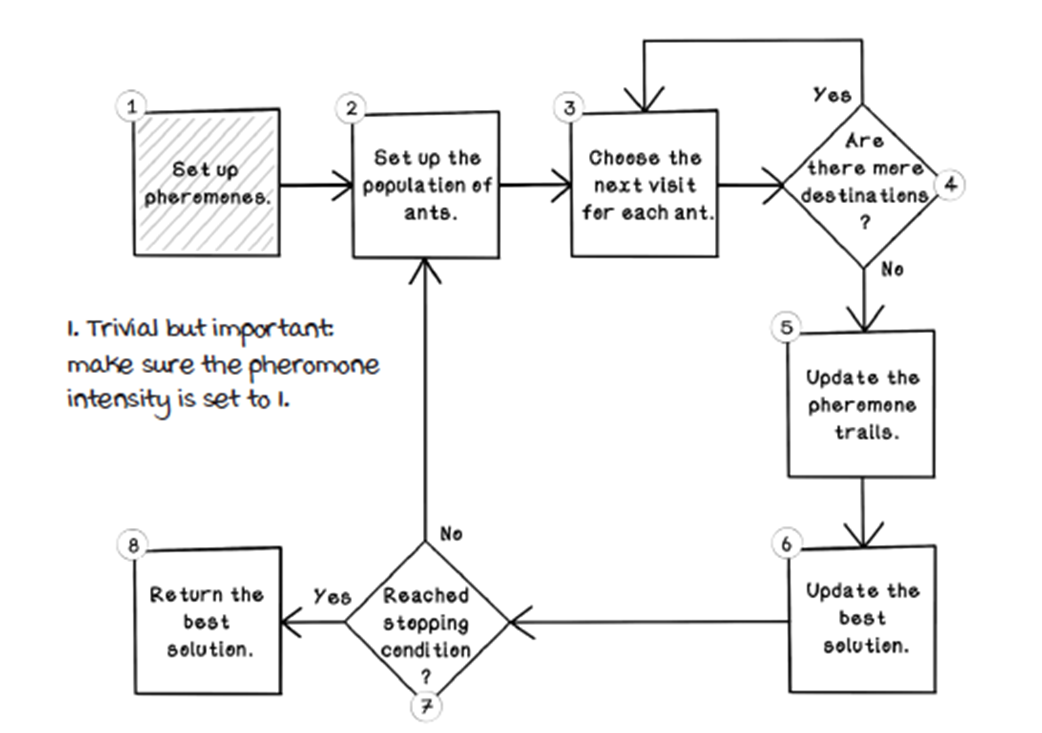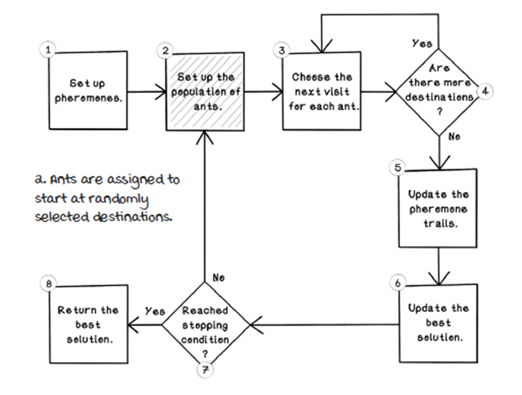 - Ant representation: stores visited nodes (memory), current position, and a way to compute tour length (fitness)How does an ant choose its next destination?For each unvisited neighbor, the ant evaluates: