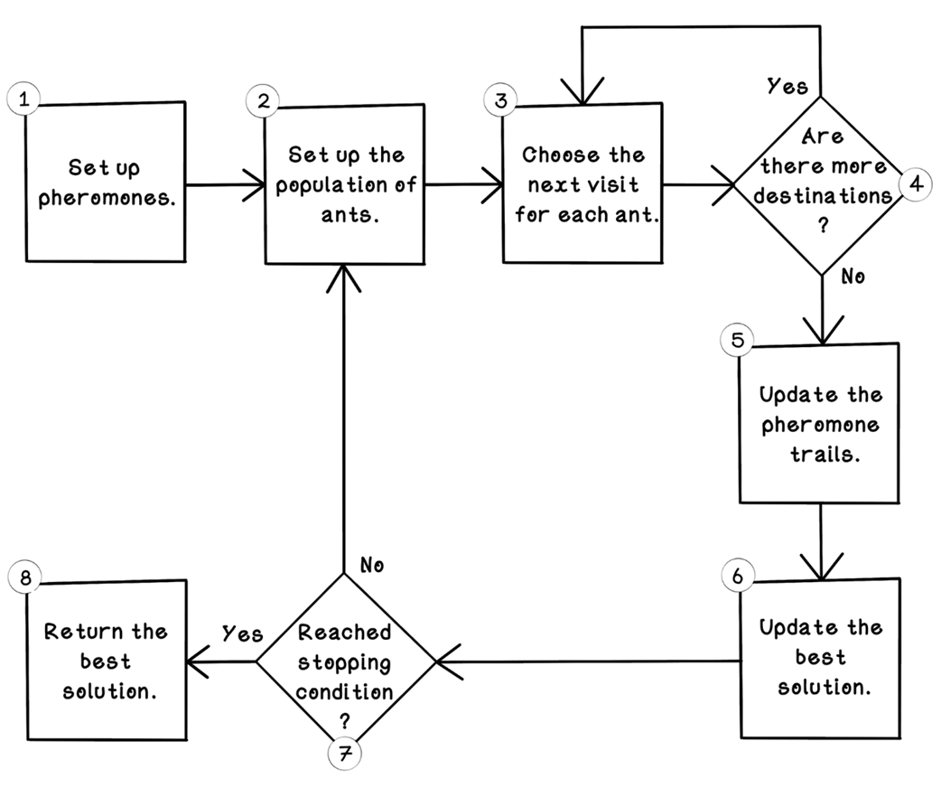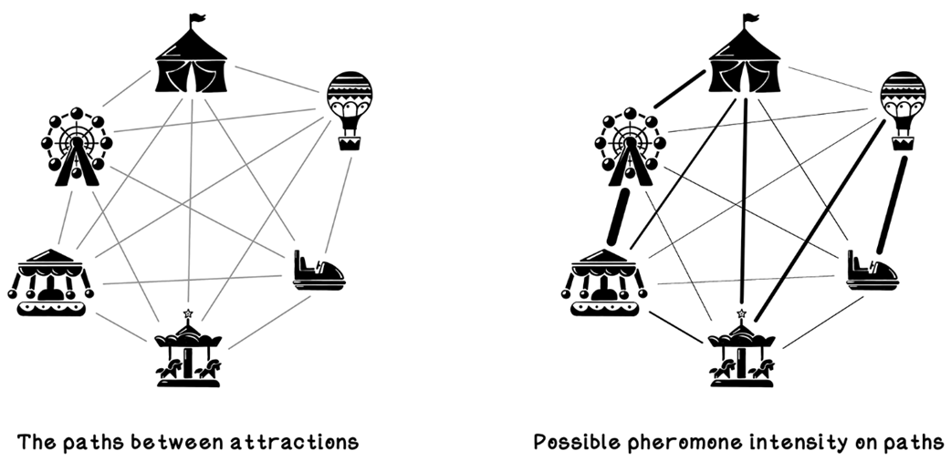 The goal is to find a short tour visiting each attraction once; as attractions grow, edges explode combinatorially, motivating ACO.What data structures do I need to implement ACO?You typically use:
