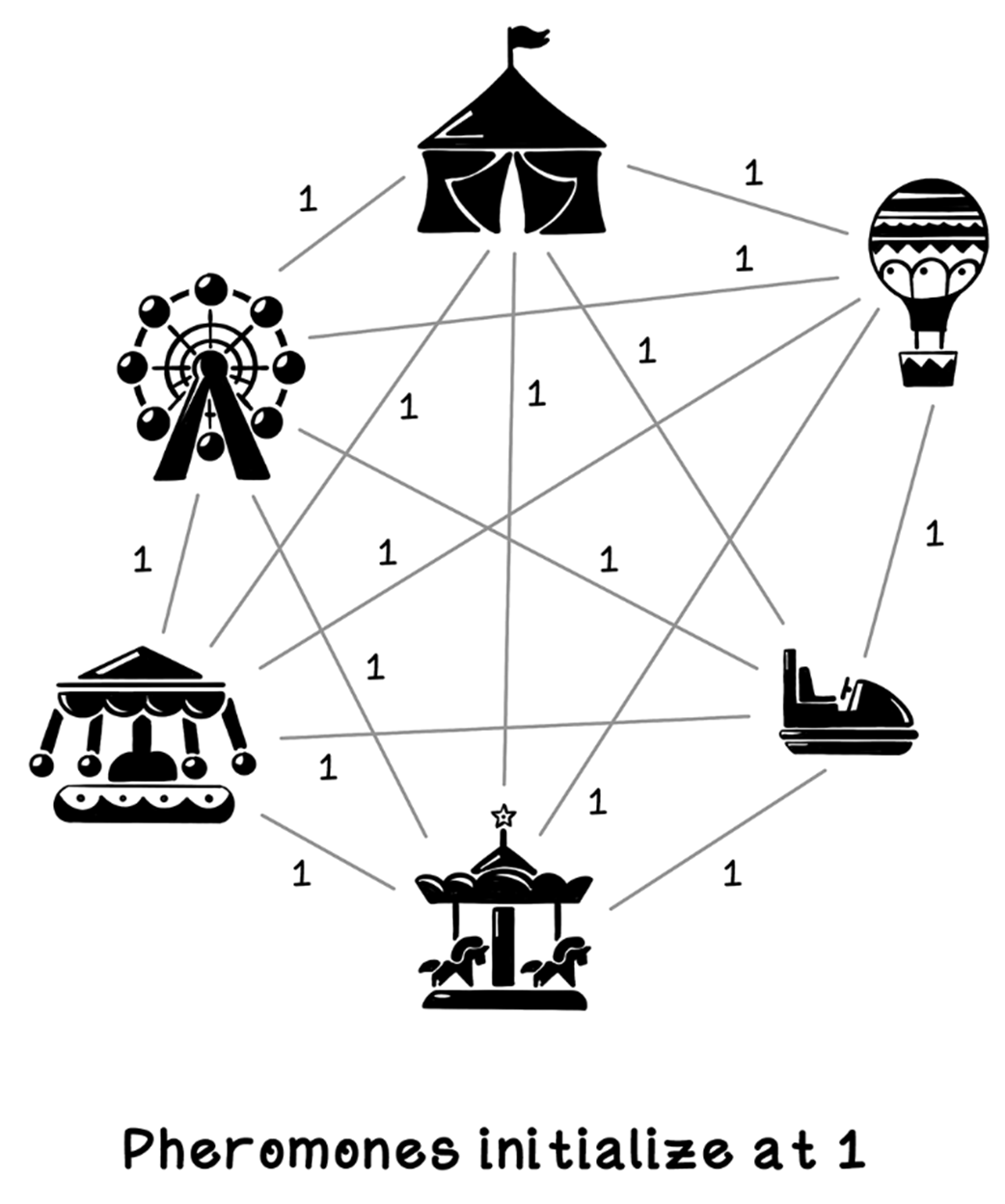 - Pheromone matrix: pheromone intensity per edge, initialized uniformly (e.g., 1)