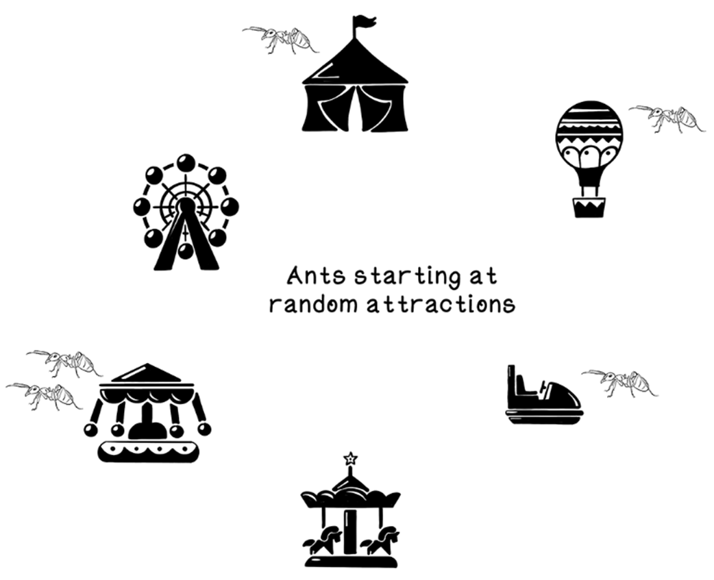 Ants start at random attractions.