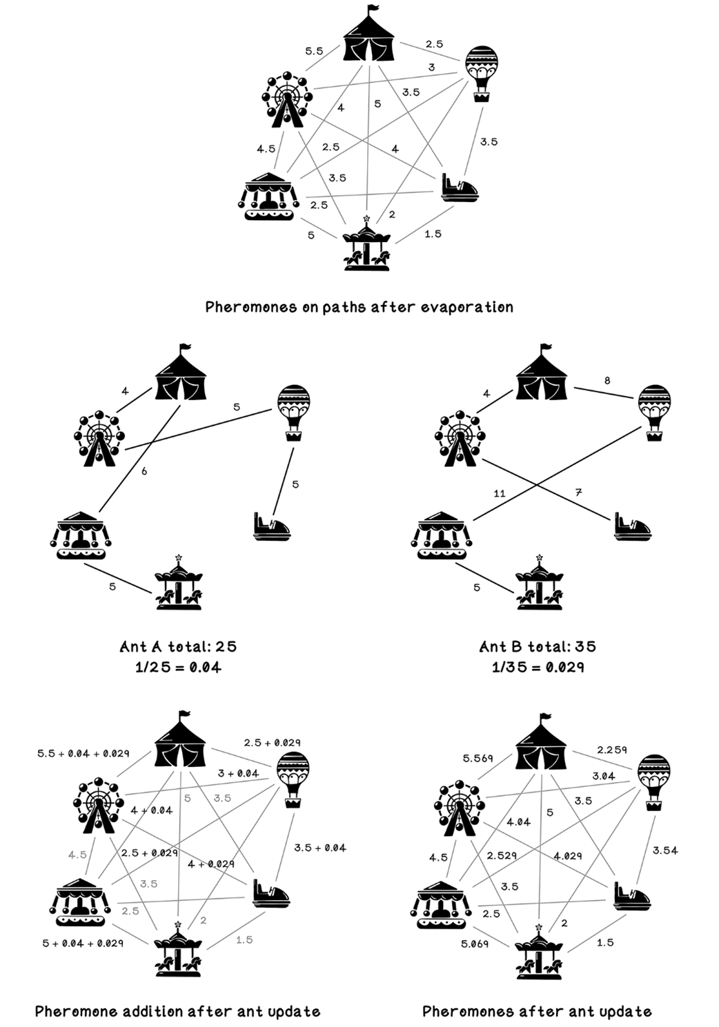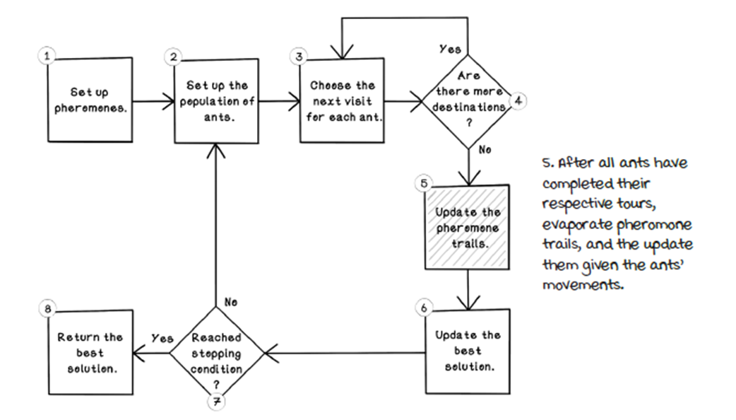 - Evaporation: multiply pheromones by an evaporation rate (< 1) to decay old information, preventing early, suboptimal paths from dominating indefinitely