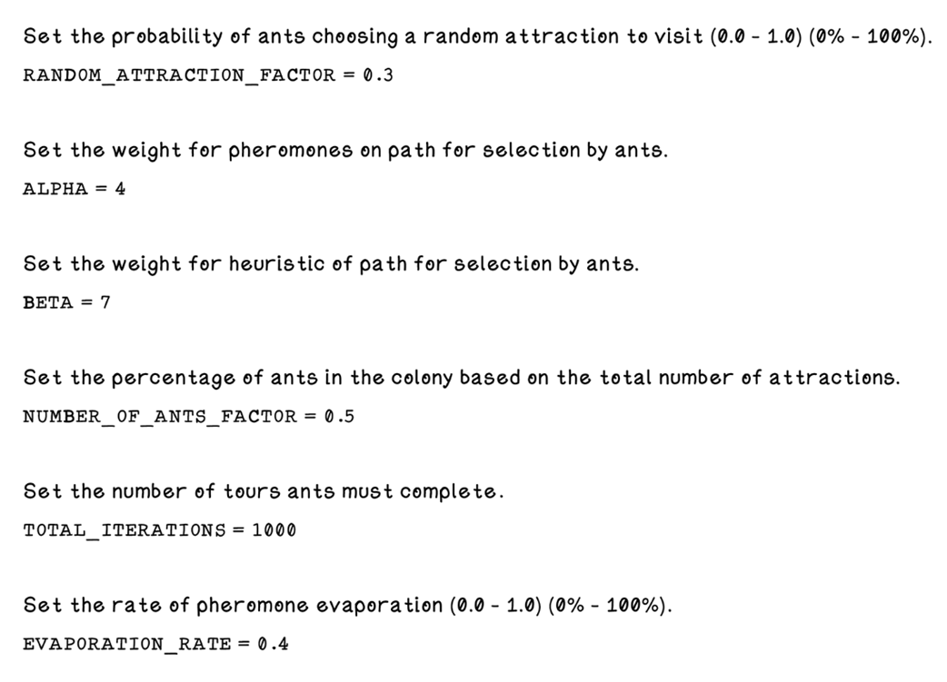 Parameters that can be tweaked in the ant colony optimization algorithm